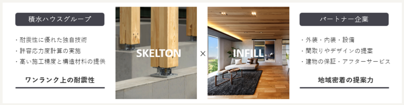 日本全体の住宅の耐震性を高めていくことを社会課題ととらえ、積水ハウスの耐震技術の根幹であるDJ構法をどのように広めていくのか、あり方を模索していきました。「土台を使わないDJ構法には精度の高い基礎が必要ですが、基礎は現場でつくるもの。いきなりビルダー様が担うのは、負担ではなかろうか?という疑問がありました。」と話すのは戸建事業戦略部長の板倉です。「そこで生まれたのが、私たち積水ハウスと全国のビルダーさんが共創するSI-COLLABORATIONです。S=スケルトン部分(基礎・駆体)を積水ハウスグループが、I=インフィル部分(外装・内装・設備)をパートナー企業様が施工するという業界初の共同建築事業として、今までにない新しい住まいづくりが始まりました。」