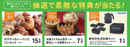 スマホでQRコードやGPSを読み取るだけでスタンプを獲得でき、集めた数に応じて大東市ならではの地元グルメや象印の生活応援セットなどが当たります。