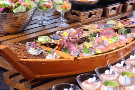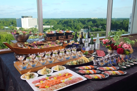 当レストランは、成田の緑豊かな景色と、離着陸する飛行機を間近に望む開放的なロケーションが魅力です。料理長が目の前で握るにぎり寿司や、揚げたての天ぷらをはじめ、旬の魚介を使ったお造り、体を温める鍋料理など、和の技が光る多彩なメニューをビュッフェスタイルでご提供いたします。