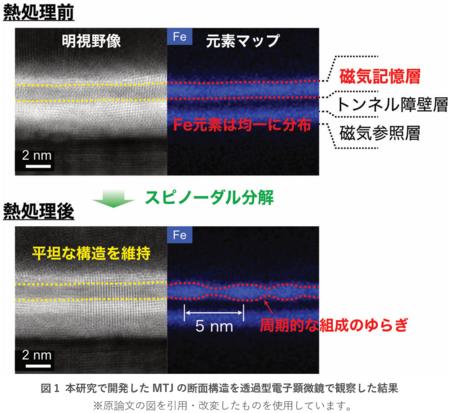 本研究で開発した鉄-マンガン基合金のMTJの断面を透過型電子顕微鏡で観察した結果を図1に示します。MTJを成膜したウエハーを成膜装置から取り出して、熱処理を行う前の状態では平坦な磁気記憶層の中に鉄元素が均一に分布していることが確認できます。そして、特定の条件で熱処理を行うと鉄-マンガン基合金がスピノーダル分解し、磁気記憶層中に周期的な鉄元素の組成ゆらぎが現れます。ここでポイントとなるのは、明視野像の比較から分かるようにスピノーダル分解の前後でMTJのミクロな膜構造や結晶構造には変化がないということです。すなわち、本研究ではスピノーダル分解を用いることで、MTJとして求められるきれいな積層構造を保った上で磁気記憶層にナノ構造を導入できることを明らかにしました。