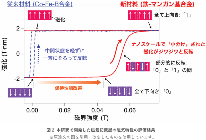 今回開発した磁気記憶層の磁気特性を評価した結果を図2に示します。「0」と「1」に対応した二つの磁化状態だけを利用する磁気メモリとは異なり、磁気メモリスタは磁気記憶層の段階的な磁化反転を利用します。従来のCo-Fe-B合金では1ミリテスラ程度のわずかな磁界で一斉に磁化が反転してしまうため、磁気メモリスタとして重要な、部分的に磁化が反転した中間状態を安定に保持することができません。一方で、スピノーダル分解によって磁化がナノスケールで「小分け」にされた鉄-マンガン基合金では50ミリテスラ程度まで磁化の状態が保持され、さらに磁界強度を増大することで「0」と「1」の間の状態を表現するのに必要な中間状態を伴いながら緩やかに磁化の反転が進行していく様子が確認されます。これらの特性は磁気メモリスタとして中間状態を制御し、その状態を安定に保持する上で非常に重要です。