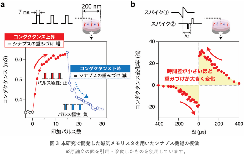 さらに、ブレインモルフィックシステムでのより具体的な応用を見据えて、シナプスの前後につながったニューロンからの電気信号の到達時間差に依存してシナプスの重みづけが変化する「スパイクタイミング依存可塑性(STDP)」を磁気メモリスタで再現することを目指しました。図3bでは、ノコギリ波状のスパイク①と、極性が反対のパルスを二つつなげたスパイク②を時間差(Δt)を変えながら磁気メモリスタに与えて、その時のコンダクタンスの変化を調べました。時間差が小さいほどコンダクタンスが大きく変化し、また時間的な前後関係によって変化の向きが逆転する結果が得られています。ここでは特に、スパイク①がスパイク②の直後に「発火」すると重みづけが減少し、スパイク①がスパイク②の直前に発火すると重みづけが増大するという非対称なSTDP学習則を実証することができました。磁気メモリスタを用いたブレインモルフィックシステムでは、図3bのコンダクタンス変化を順次足し算していくことでシナプスの重みづけを更新し、学習します。