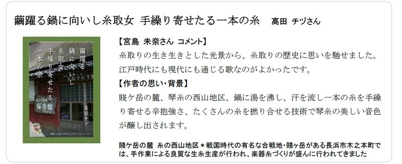 特別審査員を務めた宮島 未奈さんは、「皆さんの歌を通して、滋賀にはたくさんの魅力があるのだと改めて気付かされました。名所旧跡はもちろん、日常にひそむきらめきにも胸を打たれ、貴重な経験となりました」と総評しています。
