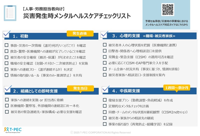 社員が自然災害や事故、従業員の自死など、予期せぬ「惨事」に直面したとき、企業には迅速かつ適切なメンタルヘルス対応が求められます。「チャットボット健康相談―惨事(予期せぬ事故/災害)ケア」等を提供するティーペック株式会社(本社:東京都台東区、代表取締役社長:鼠家 和彦)は、こうした課題に向き合う取り組みの一環として、人事担当者向けに社員の惨事発生時に会社が取るべきメンタルヘルス対応を整理したチェックリストを公開、ガイドを無料配布します。