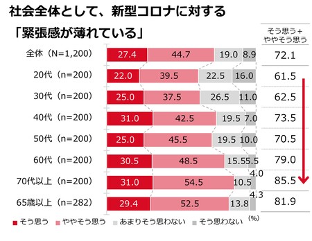 生活者の72.1%が、社会全体として新型コロナに対する「緊張感が薄れている」と回答