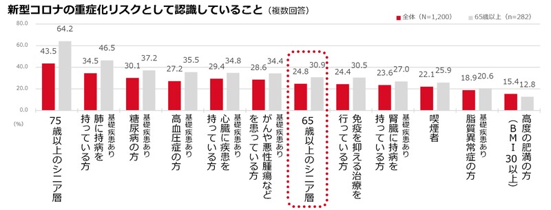 新型コロナには「高齢(65歳以上)」以外にも基礎疾患や生活習慣など、さまざまな重症化リスクがあります。新型コロナにかかった際、どんな人が重症化リスクの高い人だと思うかと聞くと、「75歳以上のシニア層」(43.5%)と回答した人が最も多く、次いで「基礎疾患あり肺に持病を持っている方」(34.5%)、「基礎疾患あり糖尿病の方」(30.1%)と回答した人が多くなっています。75歳以上の重症化リスクが高いことは4割以上が認識していますが、「65歳以上のシニア層」の重症化リスクが高いことを認識している人は24.8%とおおよそ4人に1人、65歳以上の当事者でも30.9%でした[図11]。