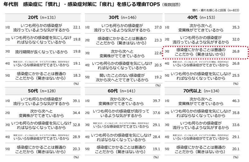 ◆生活者の約6割(60.2%)が感染症に「慣れ」を感じ、約半数(49.1%)が感染症対策に「疲れ」を感じていると回答。その理由として「いつも何らかの感染症が流行っている」「次から次へと変異株が出てきている」などと回答。
