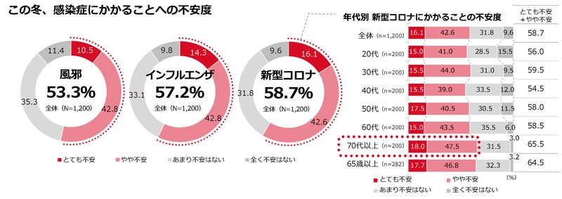 今冬、約6割(58.7%)が「新型コロナ」感染への不安を感じると回答し、特に70代以上で高い
