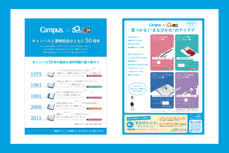 今回学生を対象として、『まなびの困りごとを解決!推し「まなびレシピ」キャンペーン』も実施します。4つのまなびレシピの中から、普段取り組んでいるもの、またはこれから取り組んでみたいレシピをひとつ選び、理由とともにご応募ください。抽選で20名様に、あなたの“まなびかた”にぴったりのCampus文具セットと『漢検 過去問題集』 をプレゼントします。(応募期間:2026年1月15日~2月28日) ※詳細は応募サイトよりご確認ください。