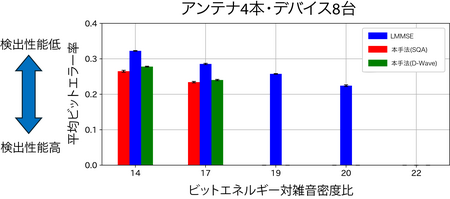 次に、本手法を無線通信実験系の基地局に実装し、屋外における電波発射実験を行いました(図3参照)。シミュレーションと同じく「基地局における受信アンテナ4本、QPSK信号(M=4)、接続デバイス数8台(K=8)」という条件下で、アニーリング手法としてはSQAとD-Wave量子アニーリング計算機の2つの手法に対して評価を行いました。実験の結果、本手法によって、SQAとD-Waveの双方の場合において、誤り率ゼロで信号検出可能であることを示しました(図4参照)。さらに実験を進め、10台のデバイスとの同時通信が可能であることも確認しています。これは、6Gで期待される多数接続性能の向上、すなわち「5Gと比べて接続デバイス密度10倍」の実現に本手法が貢献できることを実証したものです。