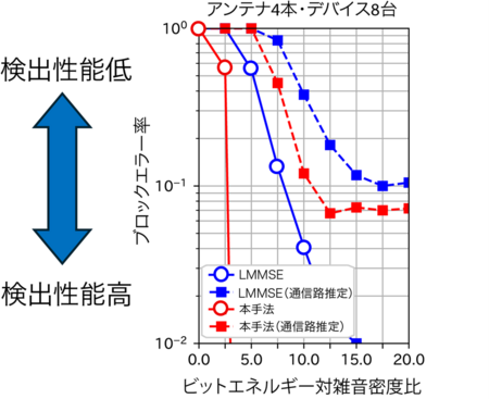 屋外実験を行う前に、「基地局における受信アンテナ4本、QPSK信号(M=4)、接続デバイス数8台(K=8)」という条件で計算機シミュレーションを行い、本手法の動作検証を実施しました。これは、4^8(4の8乗)通り(≒6万通り)のデバイスが送信する信号の組合せから、最も適切な解を探索する問題になります。なお、この実験においては、アニーリング手法としてはシミュレーテッド量子アニーリング(以下「SQA」)を用いました。その結果、現在広く用いられている近似手法(以下「LMMSE」)と比べて、本手法が高い検出性能を有することを確認しました(図2参照)。