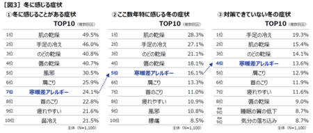 ここ数年で特に感じるようになった冬の症状は「乾燥」「手足の冷え」「寒暖差アレルギー」対策できていない症状としても上位に