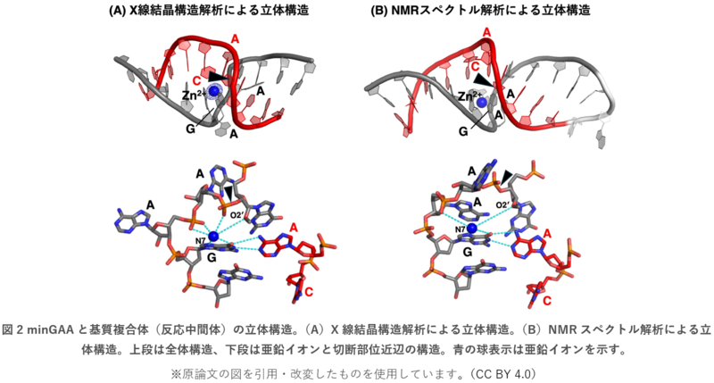 触媒メカニズムを解明するために、X線結晶構造解析およびNMRスペクトル解析による反応中間体の立体構造決定を行いました(図2)。前者は、亜鉛イオンの結合位置が明確にわかる一方で、結晶中の環境に構造が依存する傾向が高くなります(図2A)。逆に、後者は亜鉛イオンを直接には観察できませんが、溶液中の自然な立体構造を明らかにできます(図2B)。これらの補完的な手法を用いることでminGAAの立体構造は、いずれも全体的にB型構造と呼ばれる特徴を持ち、さらに触媒部のA塩基と基質のG塩基が塩基対を形成すること、亜鉛イオンはそのG塩基のN7原子と配位結合することが明らかになりました。また、水溶液中で亜鉛イオンには最大6個の水分子が配位結合しますが、これらの水分子と切断部位のO2′原子が接触できる位置関係でした。