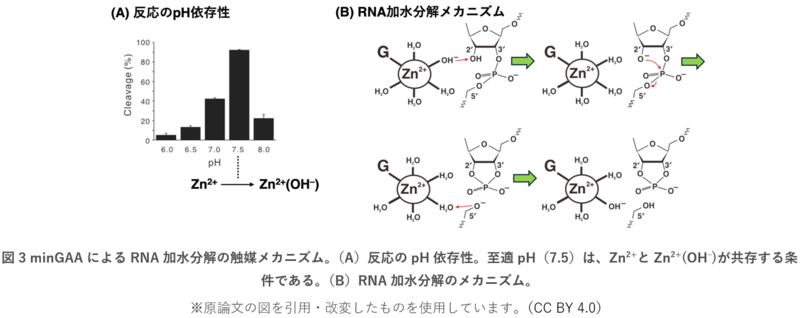 DNA酵素minGAAは、pH7.5で最大の活性を示します(図3)。この条件では、亜鉛イオンはZn2+(配位子は全てH2O)とZn2+(OH–)(配位子のうち一つがOH–)が同等の割合で共存します。触媒メカニズムにおいては、基質のG塩基と配位結合している亜鉛イオンが、Zn2+(OH–)となっている場合に、そのOH–から切断部位のO2′原子に負電荷が移動することで触媒反応が引き起こされると考えられます。このとき、RNAは切断されて末端は2′, 3′-環状リン酸の形となることが、質量分析によってわかります。負電荷はO5′原子を介して、再び亜鉛イオンの配位子に戻ります。