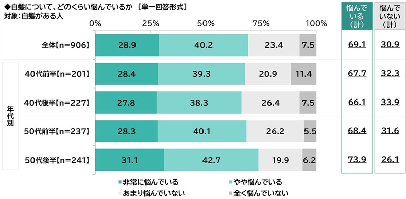 白髪がある人(906名)に、白髪について、どのくらい悩んでいるか聞いたところ、「非常に悩んでいる」が28.9%、「やや悩んでいる」が40.2%で、『悩んでいる(計)』は69.1%、「全く悩んでいない」が7.5%、「あまり悩んでいない」が23.4%で、『悩んでいない(計)』は30.9%となりました。白髪の存在が気になっていたり悩みのタネになっていたりする人が多いようです。