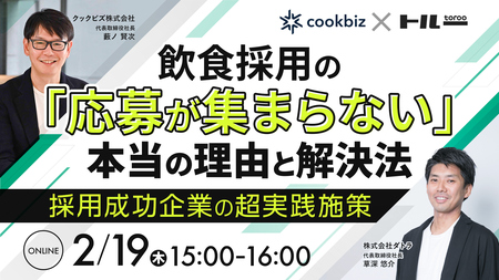 本提携に伴い、飲食企業の経営層・採用担当者様を対象とした「採用成功率を高める」共催セミナーを開催いたします。ぜひこの機会にご参加ください。