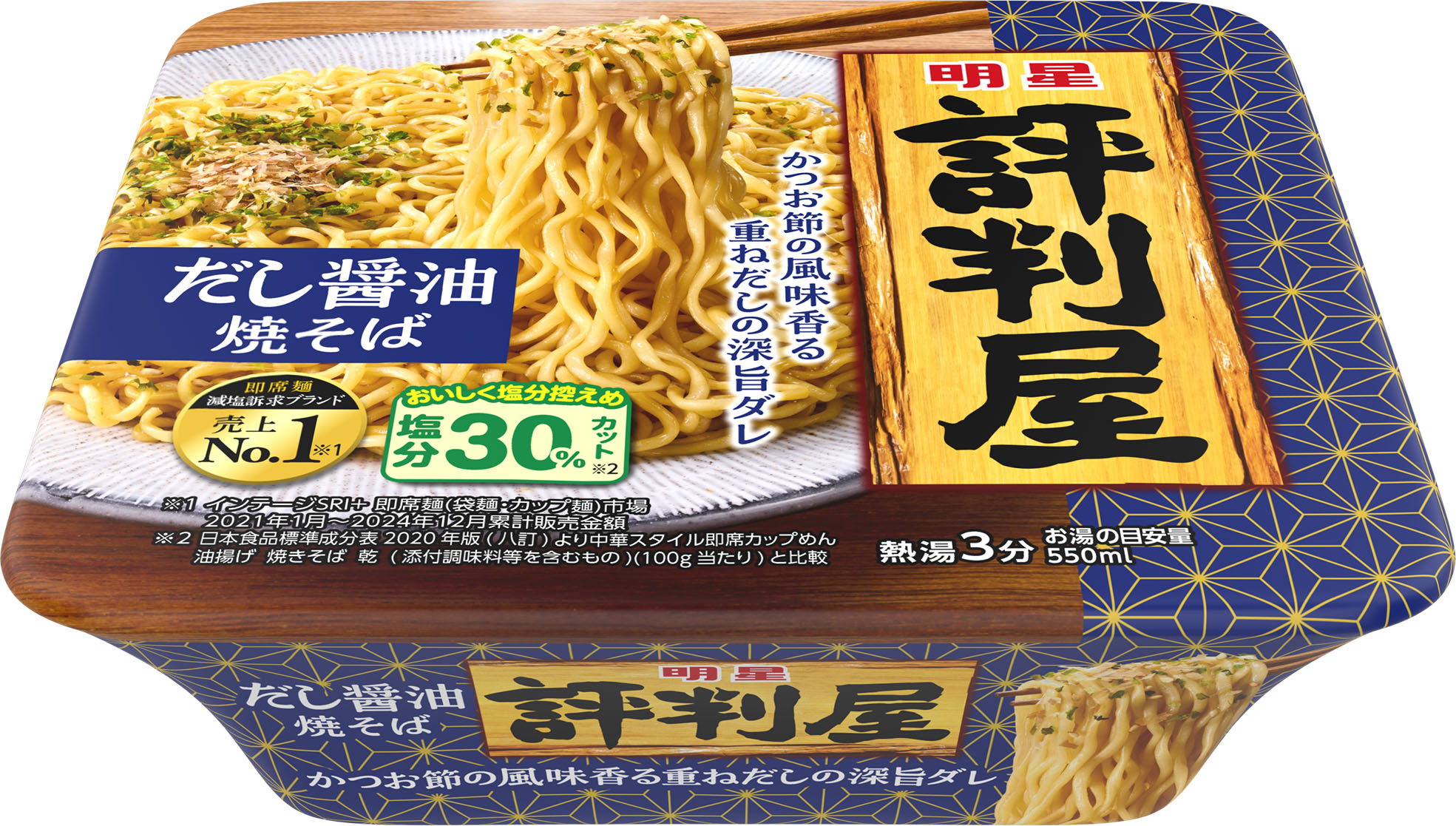 今回発売する「明星 評判屋 だし醤油焼そば」は、旨み引きたつ五島灘の塩と、かつおと昆布の旨みだしをバランスよく掛け合わせた特製たれにより、塩分30%カットを感じさせない豊かな風味を実現しました。