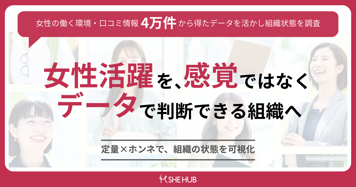 「女性活躍診断」は、女性専門の転職口コミサービス『SHEHUB(シーハブ)』に蓄積された、女性の働く環境やキャリアに関する約4万件の口コミデータを背景に、企業の組織状態を可視化する診断サービスです。