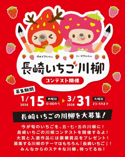 長崎いちごをテーマに「一般の部」と「中学生以下の部」から川柳を募り、大賞・入選作品には豪華賞品がプレゼントされます。