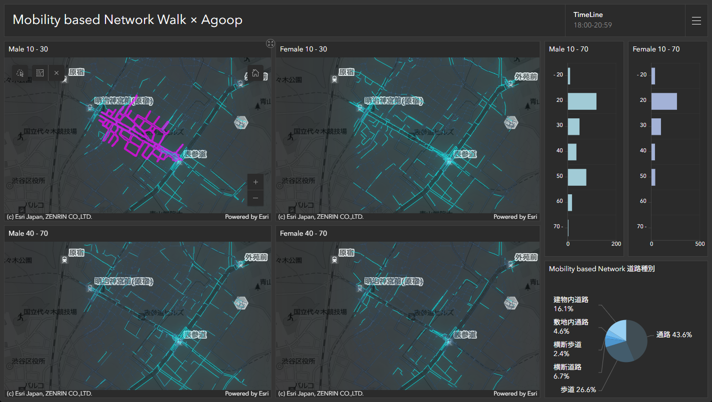 表参道周辺では、20代の人流が多い道路が把握でき、該当道路の属性もグラフで表示。