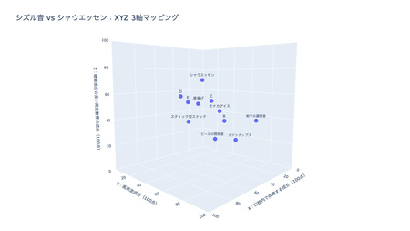 (食にまつわる音と今回調査したウインナー各製品の音を比較した3Dマップ)