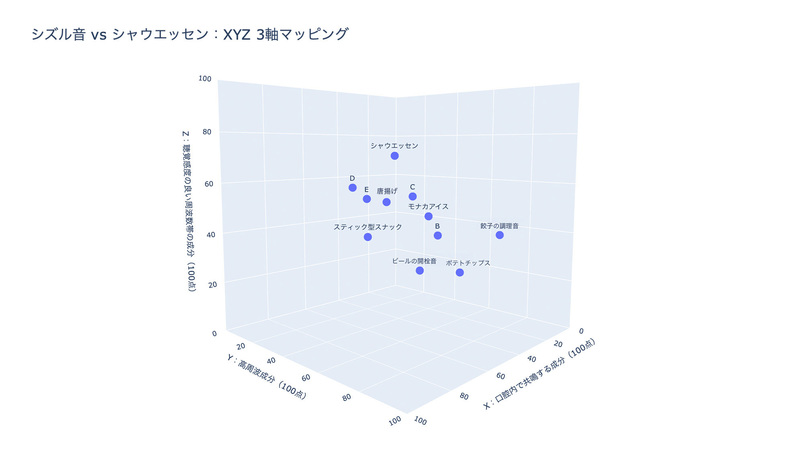 (食にまつわる音と今回調査したウインナー各製品の音を比較した3Dマップ)