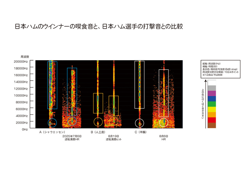 また、日本音響研究所が保有する過去のさまざまな音データと比較した結果、音の構造が野球のホームラン音に類似するとの面白い特徴も判明しました。