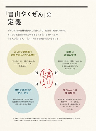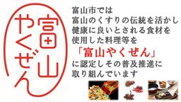 「新鮮な富山の食材を使用し、栄養面や安心・安全面に配慮しながら、古くから健康面で効果があるとされる食材を加え、食べる人に料理や食材の情報を提供できるもの」を、料理店等に公募し、専門知識を有する認定委員による試食審査を経て、「富山やくぜん」として認定しています。
