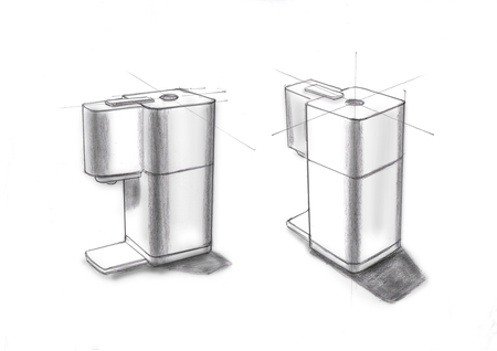 様々なアイデアのスケッチや3Dモデルを検討し、最終的にキッチンやリビング・ダイニング、デスクの上での使用用途に相応しい、シンプルかつソリッド感と一体感のあるフォルムにたどり着きました。