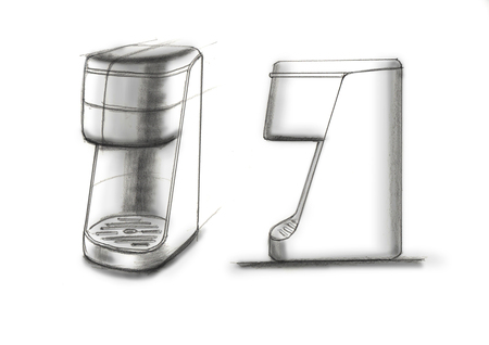 山善様より、『日常生活において多い湯沸かしのシーンにおいて、どうしても湯沸かしするまでに時間がかかることが不便で、お湯の保温も電気代のストレスになる。これらのお困りごとを解消すべく、必要な分だけ湯沸かしすることが出来、約0.5秒の短時間で給湯できる革新的な電気ポットを開発したい。』との構想よりプロジェクトがスタートしました。また、湯沸かしだけでなくコーヒーメーカーやお茶メーカーとしての要素も取り込み時短性だけでなく省スペース性も実現できること、タンクの水全てを沸かさないので、転倒した際も安心・安全な構造にしたいとの商品コンセプトより、それらに相応しいデザインを考案しました。