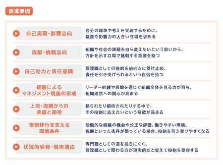 具体的には、自身の考えを実現したいという意欲、組織や業務の改善に挑戦したいという思い、役割を果たすことへの自信や責任意識、経験を通じて広がった視座などが挙げられます。加えて、上司や周囲から寄せられる期待や、役割移行を後押しする制度・環境条件も、管理職志向を高める要因として影響していることがうかがえました。