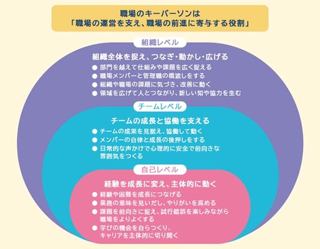職場のキーパーソンは「自己・チーム・組織」の3レベルで役割が整理でき、管理職だけでは担いきれない機能を補完していた