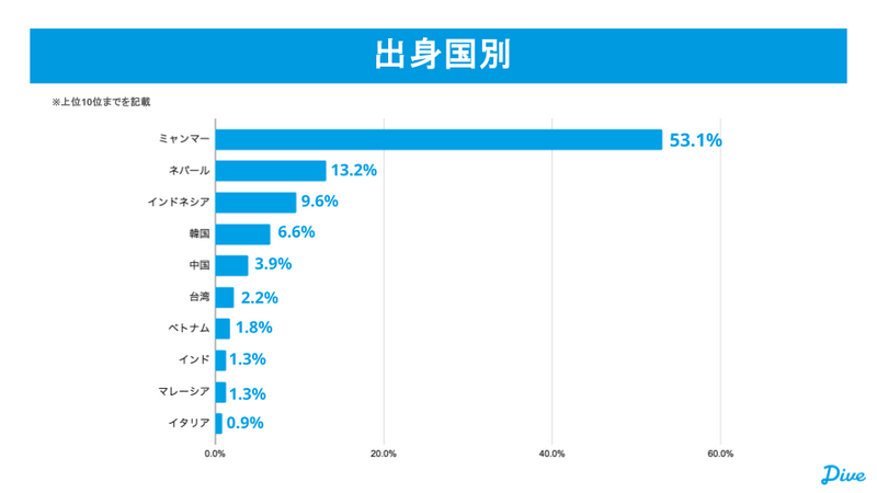 就業者の国籍は、ミャンマー出身者が最も多く約5割を占めており、次いでネパール、インドネシア、韓国、中国、台湾、ベトナムなど、東南アジア・南アジアを中心に多岐にわたっています。