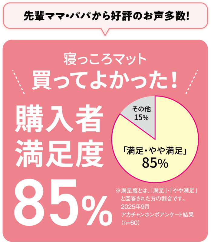 「買ってよかった!」と先輩ママ・パパから好評の声をいただき、購入者満足度も85%※を獲得。このマットがあれば、赤ちゃんのおふろタイムがとってもラクに!出産準備用品にもおすすめです。