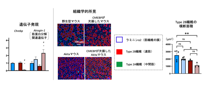 本研究では、インスリン不足によって生じるダイアベティスのモデルマウス(Akitaマウス)と、糖を感知する仕組みに重要な役割をもつ転写因子ChREBPを欠いたマウスを組み合わせて解析しました。その結果、血糖値が同程度に高くても、ChREBPが欠損すると、筋肉量と筋力が著しく低下し、寿命も短くなることが明らかになりました。さらに筋肉の組織を詳しく調べたところ、筋肉を分解する方向に働く遺伝子の発現が高まり、とくに瞬発力を担う筋繊維が細くなっていることが確認されました。これらの結果から、ChREBPを介した「糖を感知する仕組み」が、ダイアベティスの状態において筋肉を守る重要な役割を担っている可能性が示唆されました。
