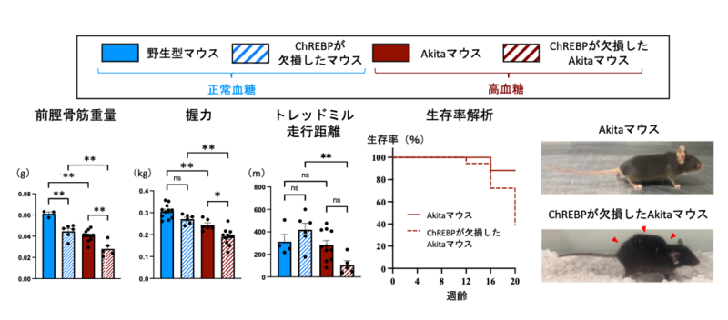 ・インスリン不足によって生じるダイアベティスのモデルマウスにおいて、ChREBPを欠損させると、血糖値が同程度であっても、著しい筋萎縮、筋力低下、さらには寿命の短縮が認められました。