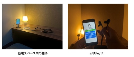 仮眠スペースシェアリングサービス「仮眠を文化に」の提携店舗である「SENSE sauna」にて、イヤホン型仮眠起床AIシステム「sNAPout®」を装着し30分ほど仮眠を体験いただけます。 |