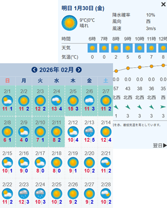 試験日がまだ先の場合も、90日間予報があるので、現時点での試験日の天気・気温の見込を確認できます。