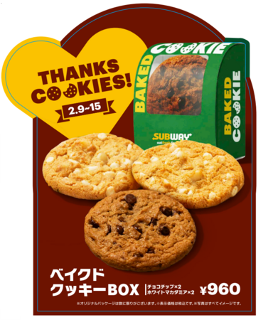 WATAMI FAST CASUAL MANAGEMENT株式会社(本社:東京都大田区)が展開するサンドイッチチェーン「サブウェイ」は、店内で焼き上げるクッキー『チョコチップ』『ホワイトマカダミア』の4枚がセットになった『ベイクドクッキーBOX』を2026年2月9日(月)から全国のサブウェイにて期間限定で発売します。