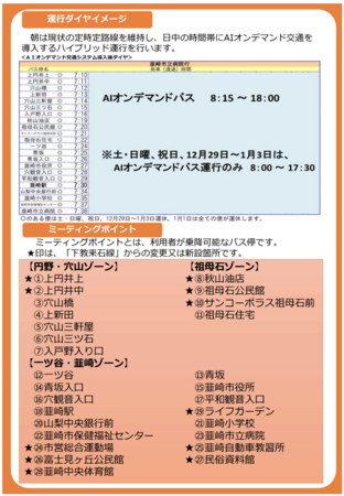 新路線では、朝の通勤・通学時間帯に合わせた定時運行に加え、日中は予約制のAIオンデマンド交通を導入。利用状況に応じて最適なルートで運行する「ハイブリッド運行」を行います。