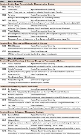 本年度のプログラムは、薬学関連研究分野における国内外の第一線で活躍する20名の卓越した研究者による先端的な講演を構成しています。京都薬科大学の高度な研究基盤をもとに、革新的な学術的知見の交流と、次世代の共同研究への戦略的な展望を見据えた、極めて意義深い学術イベントとして企画しております。