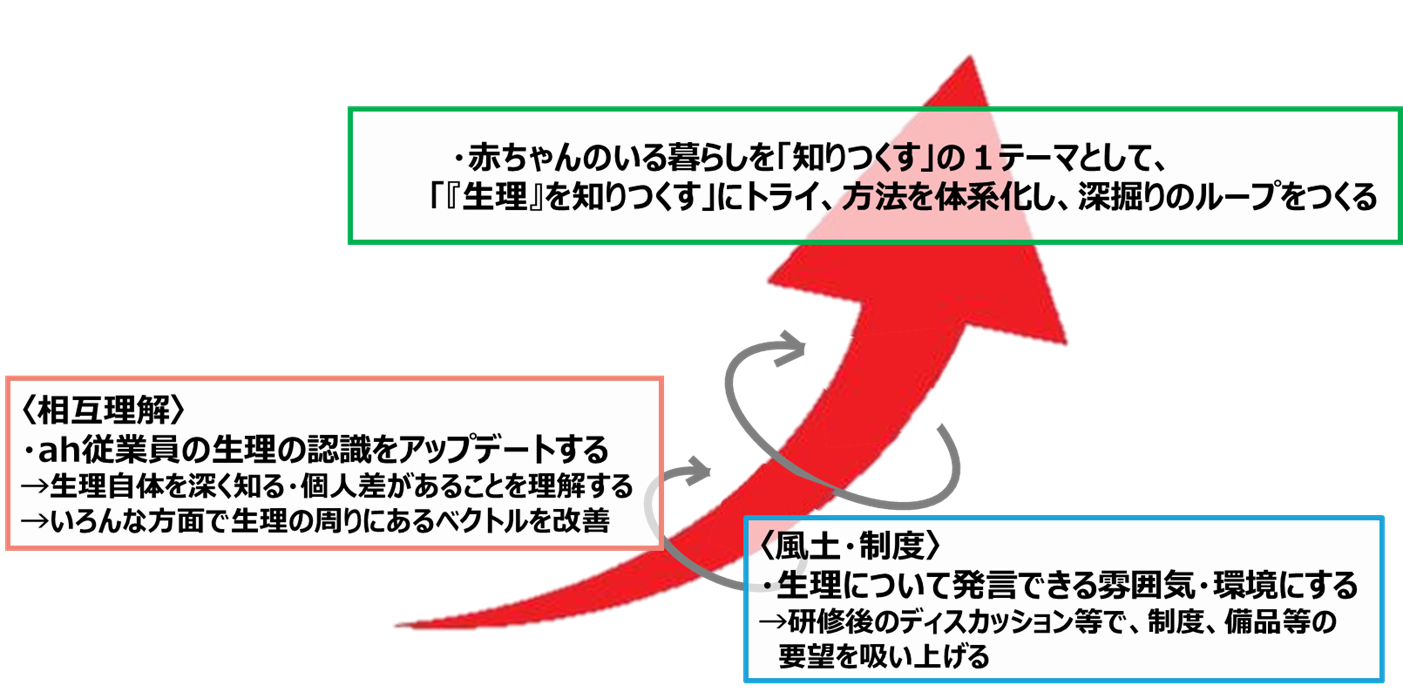 研修はユニ・チャーム株式会社の「ソフィ みんなの生理研修」を導入し、さらに生理の疑似体験のほかグループディスカッションなど赤ちゃん本舗独自のプログラム設計を行いました。