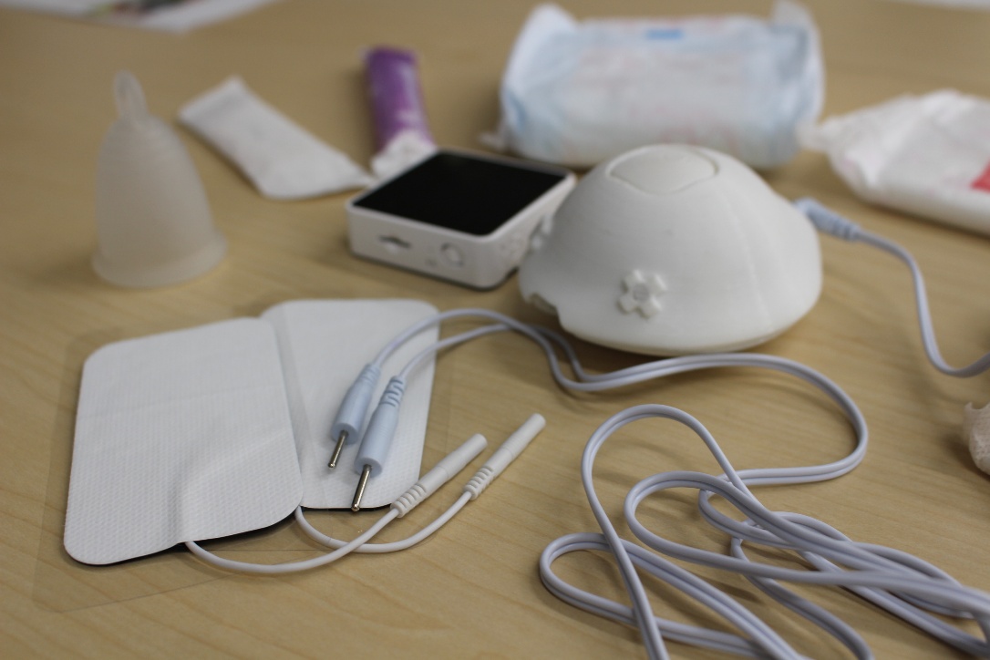 特長は、講義に加えて、実物(生理用品)に触れる体験と、株式会社リンケージが提供する「ピリオノイド」というデバイスを使った体験。「ピリオノイド」は下腹部に直接パッドを貼り付け、デバイスコードを接続すれば完了。EMS(Electrical Muscle Stimulation、筋電気刺激技術)を用いて、子宮が経血を外に押し出すときの感覚や痛みを疑似体験できます。