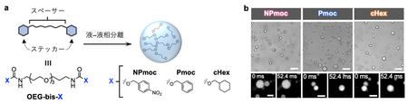 a) OEG-bis-NPmocまたはOEG-bis-cHexからなるコアセルベートはいずれもTMR-デキストランを取り込むが、その内部への取り込み挙動はデキストランの分子量に依存した。Pmocコアセルベートは分子量約70,000のTMR-デキストランを内部に取り込む一方、cHexコアセルベートでは表層への集積に留まる様子が蛍光顕微鏡により確認された (スケールバー: 10 µm)。