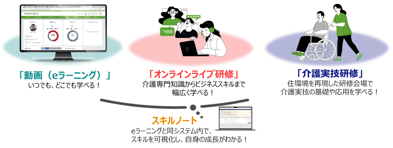 『スキル ドライブ』は、職員のスキルを可視化するアセスメントツール「スキルノート」に加え、「動画研修(eラーニング)」「オンラインライブ研修」「介護実技研修」の3つのアプローチを連動させた、介護に特化した人材育成サービスです。「知識→理解→実践」までを段階的にサポートすることで、知識や技術の習得を促します。育成における多様な課題を総合的に支援し、継続的に成長できる学習環境を提供します。これら4つのサービスを、1事業所あたり年間138,000円(税込 151,800円)で全て利用することが可能です。
