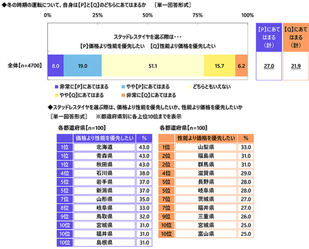 都道府県別にみると、スタッドレスタイヤを選ぶ際に価格より性能を優先したい人の割合では、1位は北海道・青森県・秋田県(いずれも43.0%)と、冬の時期の積雪量が多い道県が1位に挙がりました。他方、スタッドレスタイヤを選ぶ際に性能より価格を優先したい人の割合では、1位は山梨県(33.0%)、2位は福島県と群馬県(いずれも31.0%)となりました。