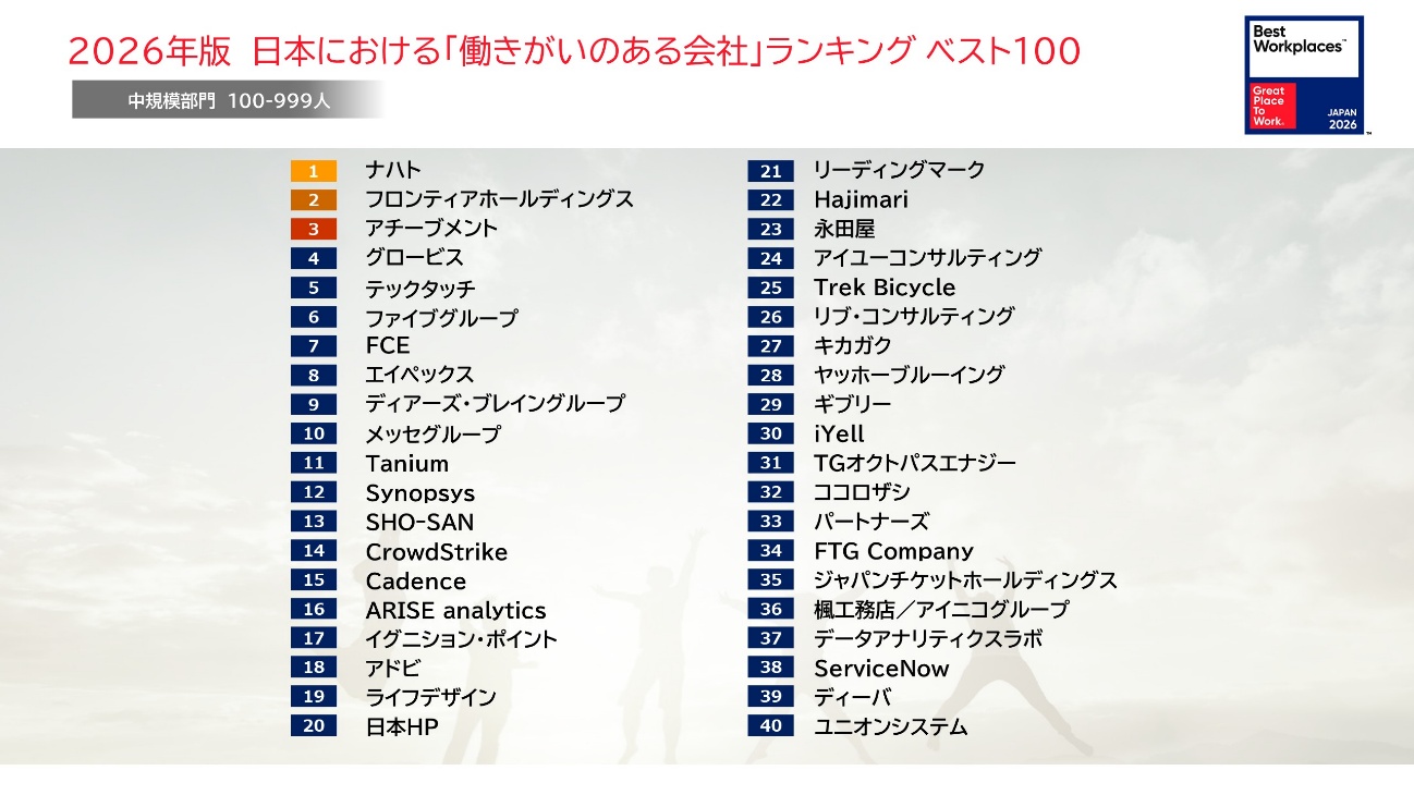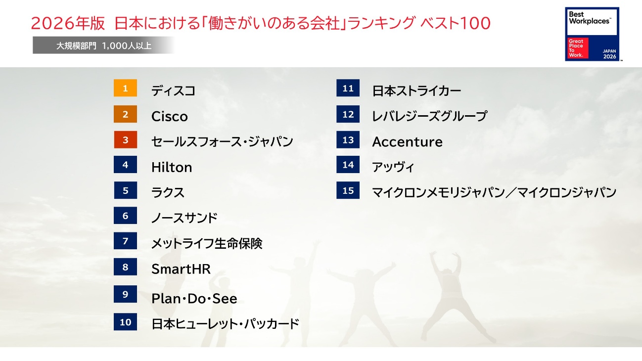 「働きがいのある会社」に関する調査・認定を行うGreat Place To Work® Institute Japan(本社:東京都港区、代表取締役社長:荒川陽子、以下GPTW Japan)は、 2026年版 日本における「働きがいのある会社」ランキング ベスト100を、2月6日(金)に発表しましたので、お知らせいたします。
