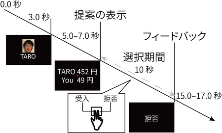 図1 最後通牒ゲーム実験参加者は提案者(この試行ではTARO)からのお金の分配提案を受け入れるか拒否するか10秒以内に選択する。受け入れれば提案通りにお金が分配され、拒否すれば両者の取り分は0円となる。提案者は試行ごとに異なり、7パターンの異なる分配を用いた。