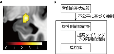 以上の結果は、ヒトが不公平な提案を受け入れる際には、背側前帯状皮質が腹外側前頭前野を介して、扁桃体に表現される不公平に伴う感情・情動を抑制する脳内メカニズムが重要であることがわかりました(図4B参照)。