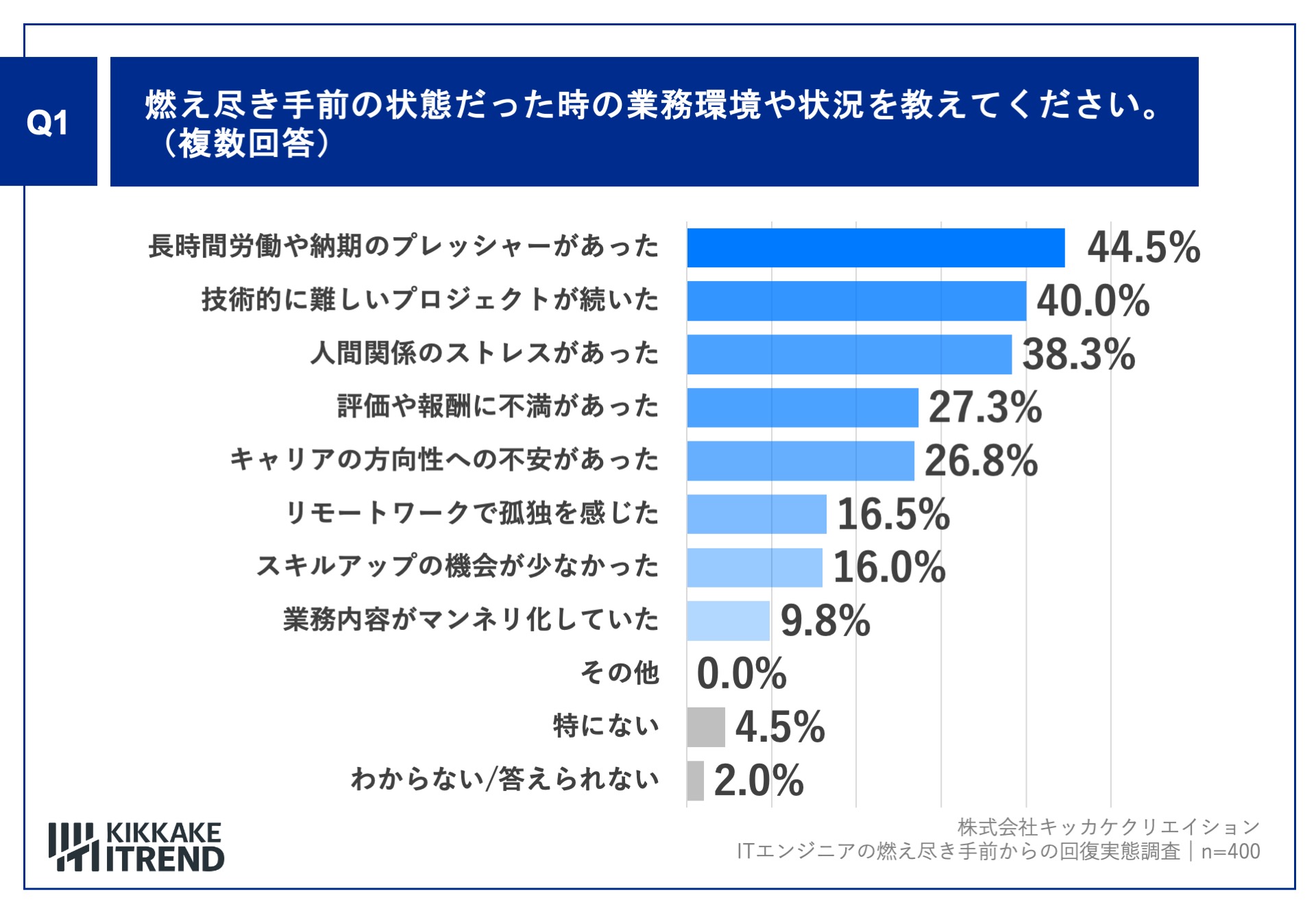 「Q1.燃え尽き手前の状態だった時の業務環境や状況を教えてください。(複数回答)」(n=400)と質問したところ、「長時間労働や納期のプレッシャーがあった」が44.5%、「技術的に難しいプロジェクトが続いた」が40.0%という回答となりました。